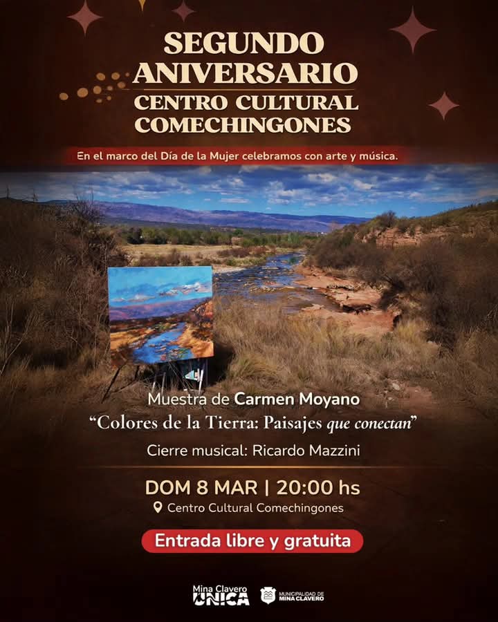 El marco de esta celebración no es menor. El Centro Cultural Comechingones cumple dos años de vida y lo festeja con una propuesta que integra pintura, música y naturaleza. Luego de la inauguración de la muestra, el cierre musical estará a cargo de Ricardo Mazzini, quien pondrá sonido a una noche que promete ser de esas que quedan en la memoria colectiva.